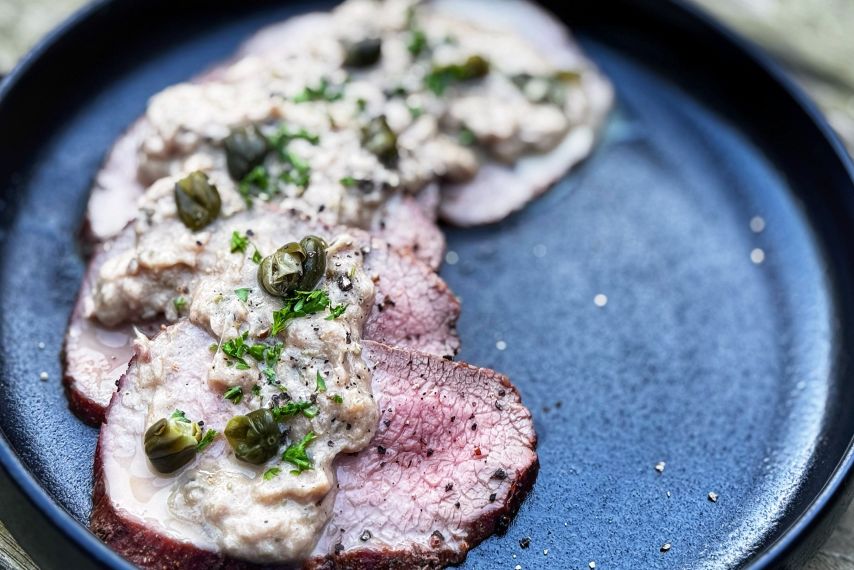 Serveer het vlees met de tonijnmayonaise en garneer met kappertjes en peterselie. Eetsmakelijk!